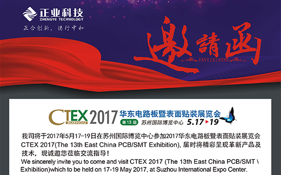 一年一度的華東電路板暨表面貼裝展(CTEX 2017)就要來啦!正業(yè)科技將隆重參加此展會(huì),展示公司最新的技術(shù)成果,至誠(chéng)邀請(qǐng)新老客戶參加蒞臨我司展位觀摩指導(dǎo)。
